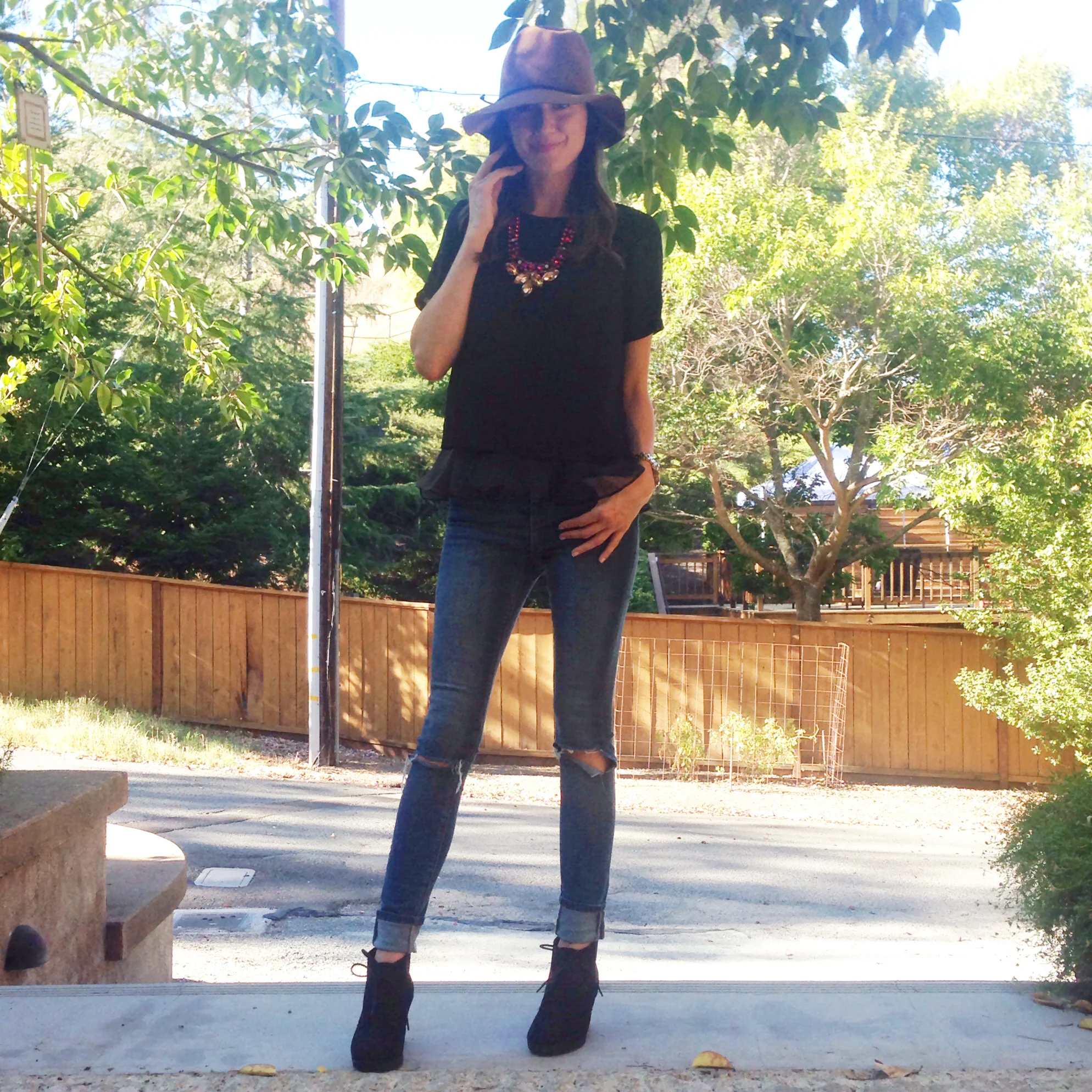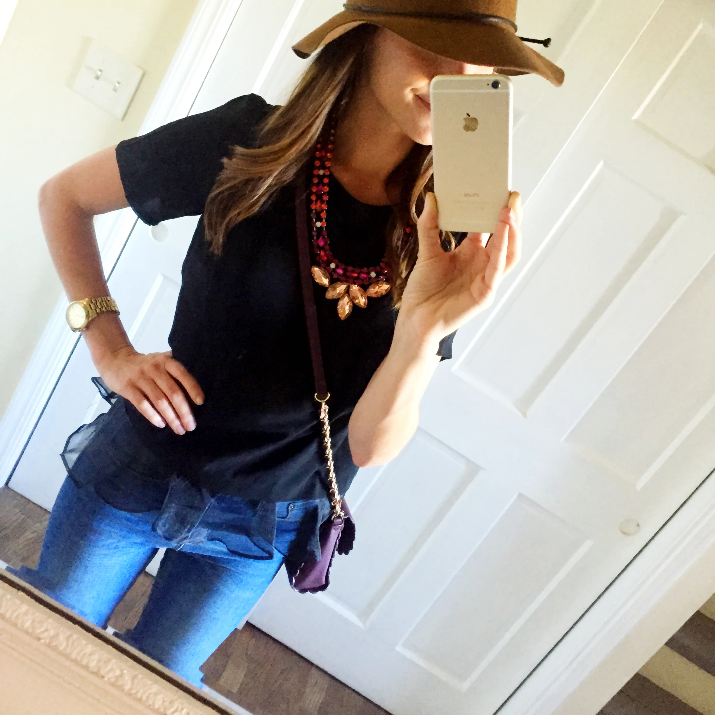 And then there's this ASOS top. It's a lightweight, silky tee with an organza frill hem. Umm, yea I just said that. It's so sweet and flirty and the organza adds so much interest to a little black tee. LBT? With distressed denim, black lace up wedges that I forgot I had (also Target) and a gorgeous pop of Accessory Jane, I was feeling like fall even in 85 degrees.