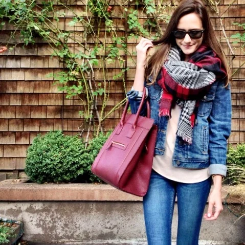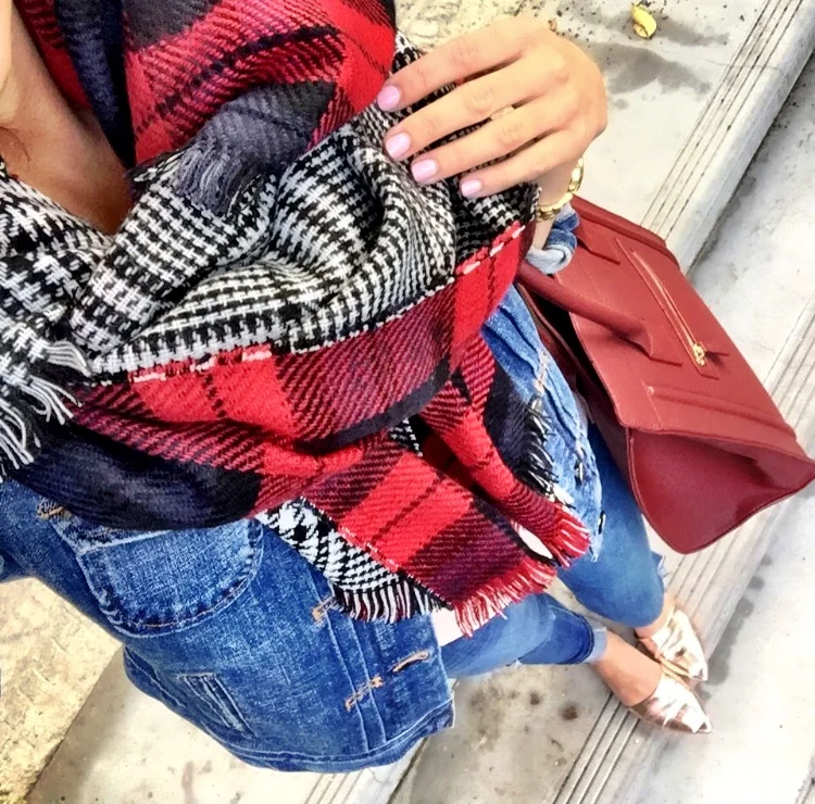With the temperatures dropping and winter quickly approaching, scarves are becoming the easiest and most functional way to accessorize. My simple denim on denim look got an instant update thanks to a pop of... blanket scarf! Last season I completely missed out on the blanket scarf craze and I seem to be on a mission to make up for it this year. I picked up the infamous tartan scarf on eBay last month, but had also had my eye on this one for quite some time. When I saw it on Brina Box I knew I (might as well) snag it, and I have to say... I think I might like it even more than my tartan. Is it weird to say I think the tartan washes me out?! This one is double sided which means you get a mix of two of the seasons trendiest patterns, plaid and houndstooth, and of course, extra bang for your buck. With the multitude of ways to tie a blanket scarf (not to mention, it's actual function as a blanket!) it really is like getting at least(!) 10 different scarves in one.