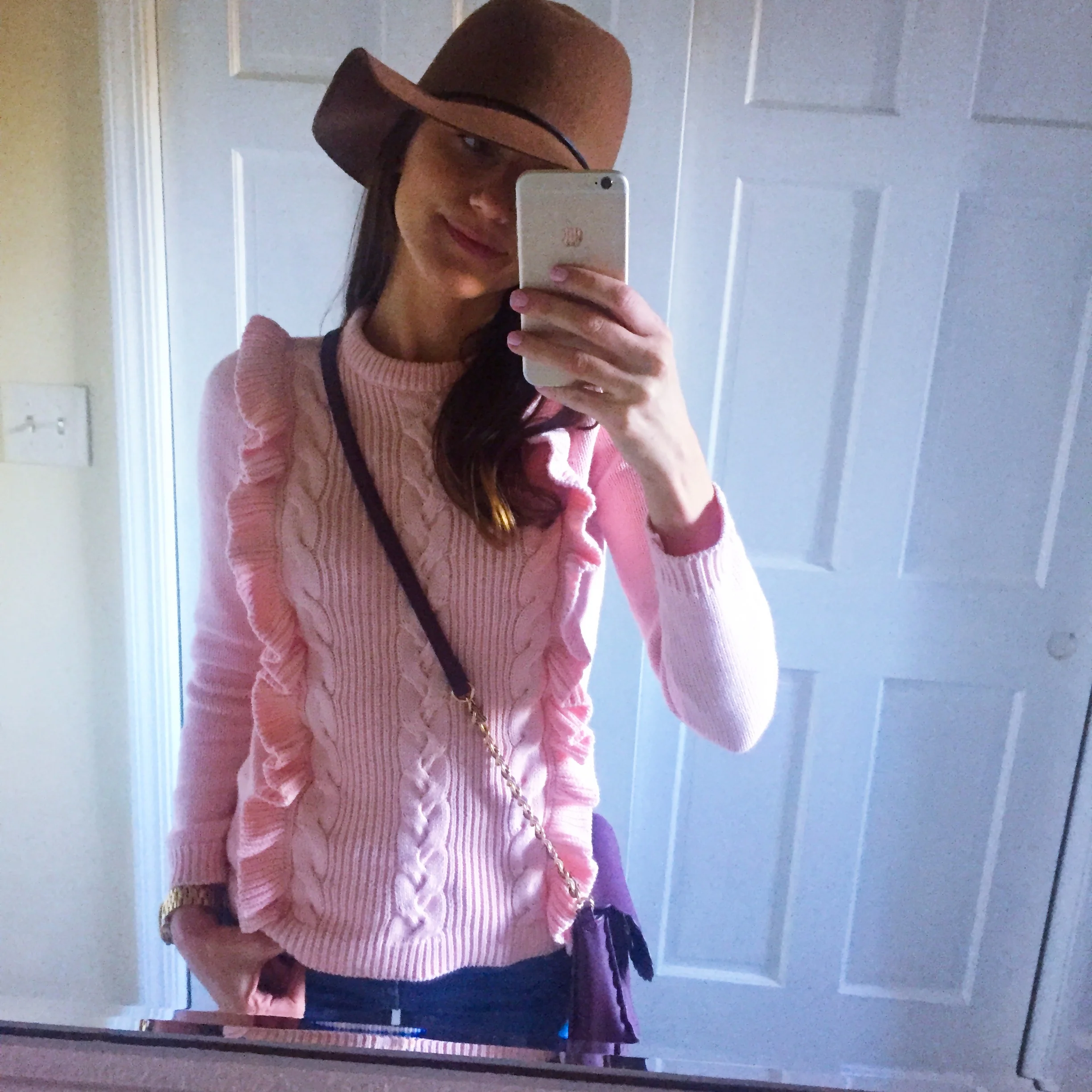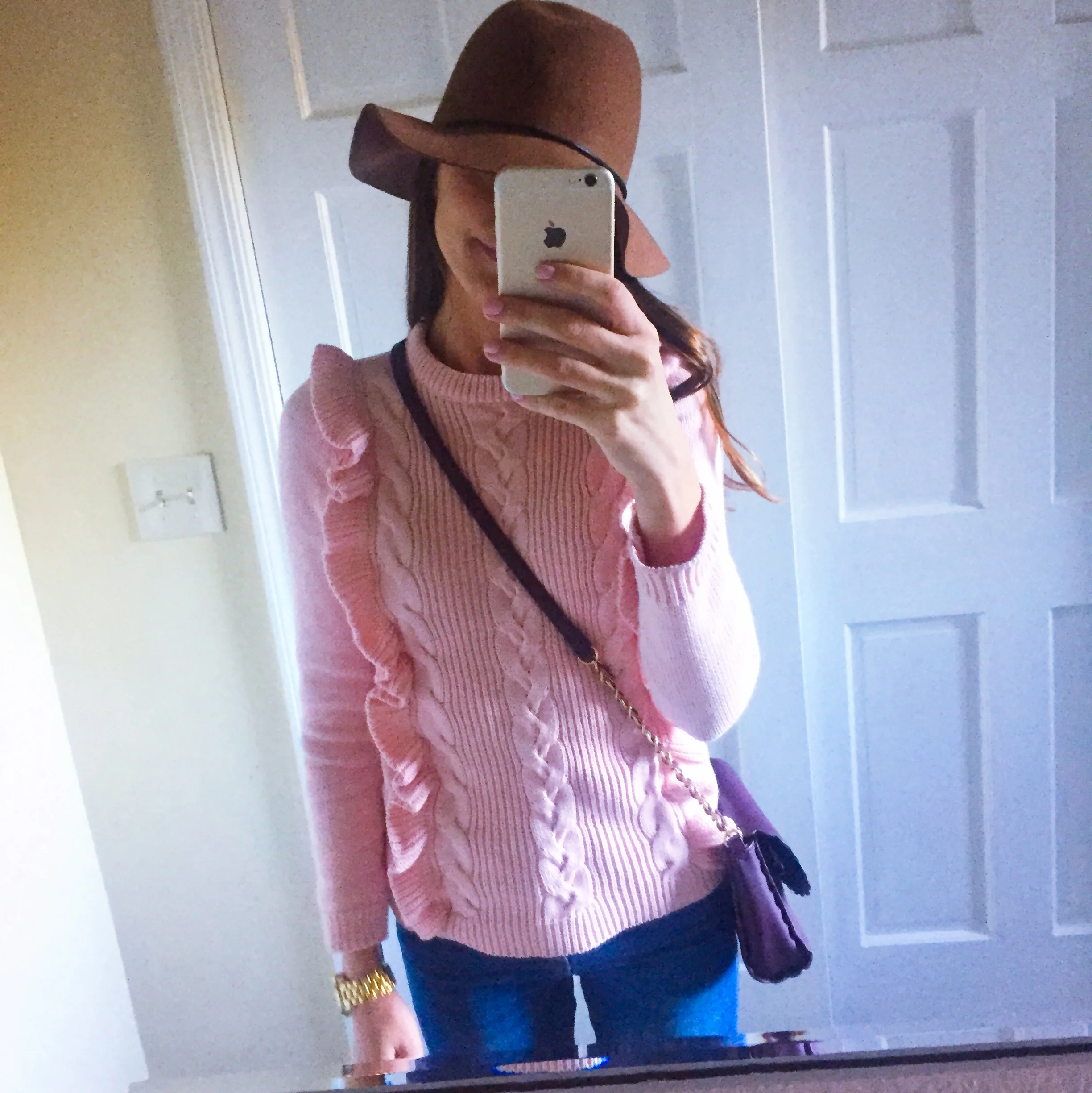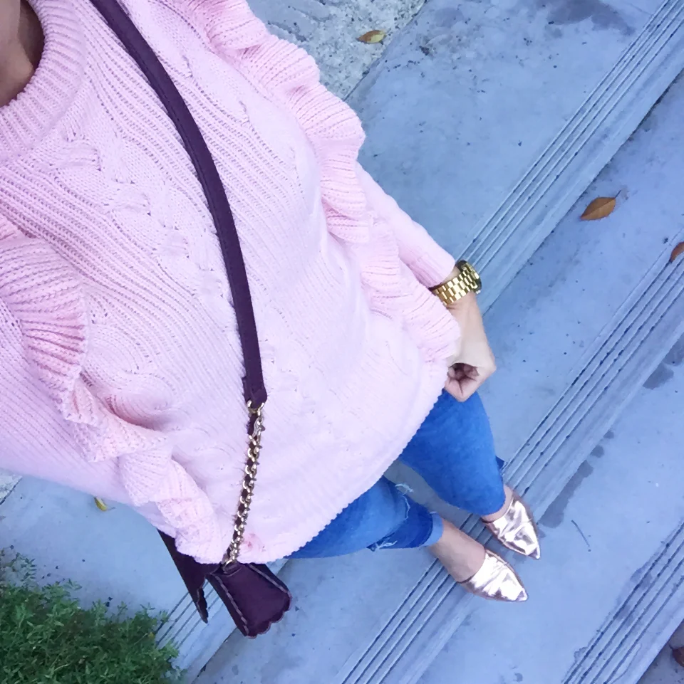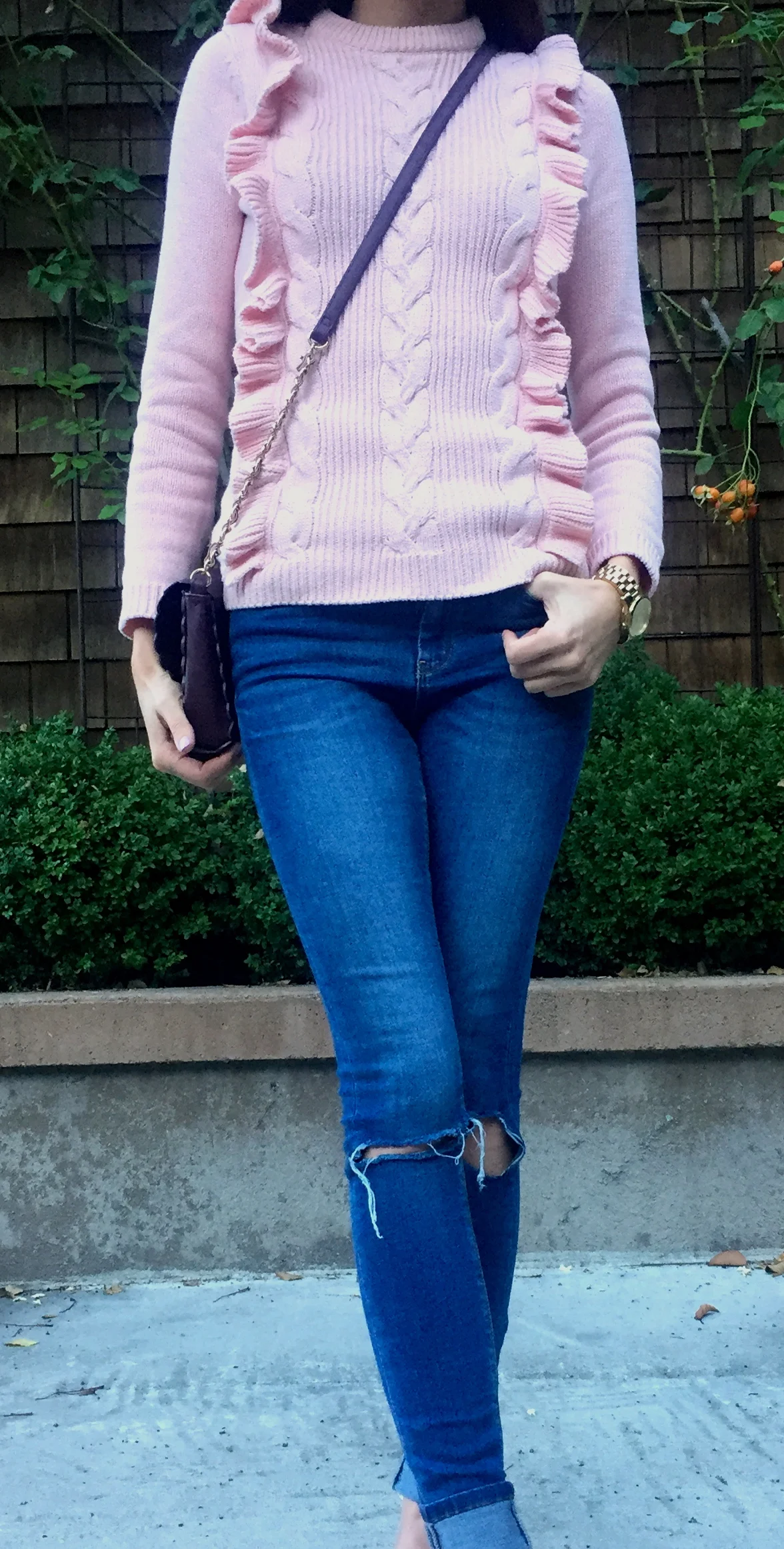 Cable knit sweaters and fall go hand in hand. Obviously. And now that there has been a steady chill in the air, I am in full-on sweater weather mode and ones that are easy to pull on and go are always a win. I love the classic cream and white versions, but never have I ever found a cable knit as adorable as this one from ASOS. It's pink and it's ruffled and I think that's kind of enough said. It's the perfect blend of classic and feminine, and pairs oh so perfectly with my favorite distressed denim.
