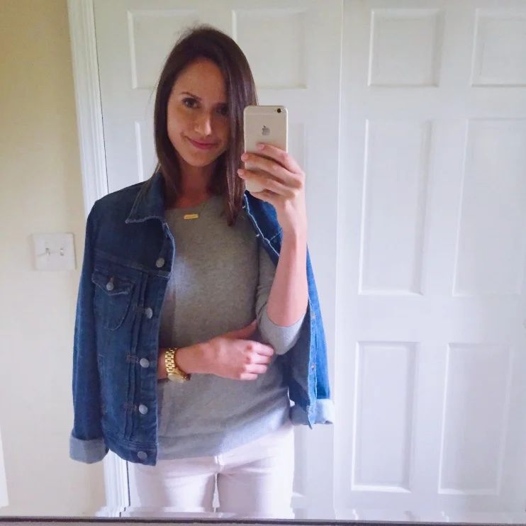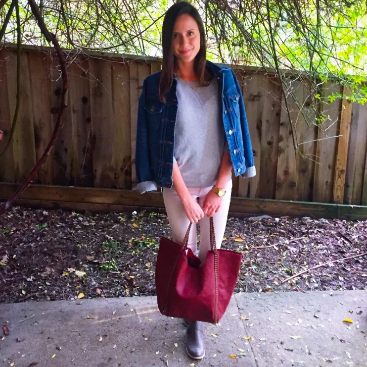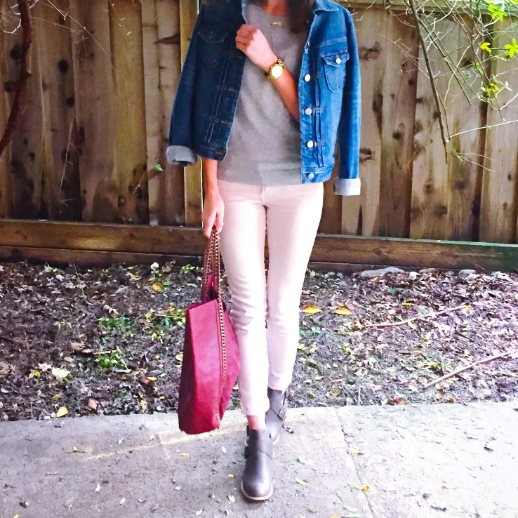 I'm a big fan of neutrals and pastels all year round, but especially during the winter months. There's something so crisp and clean about about a little winter white, grey, or even pastel pink. These Jbrand skinnies are a soft pink that get a lot of spring and summer wear, but I am loving the lighter colors for fall and winter, too. A denim jacket, neutral booties, and a pop of oxblood take this springy look into winter!