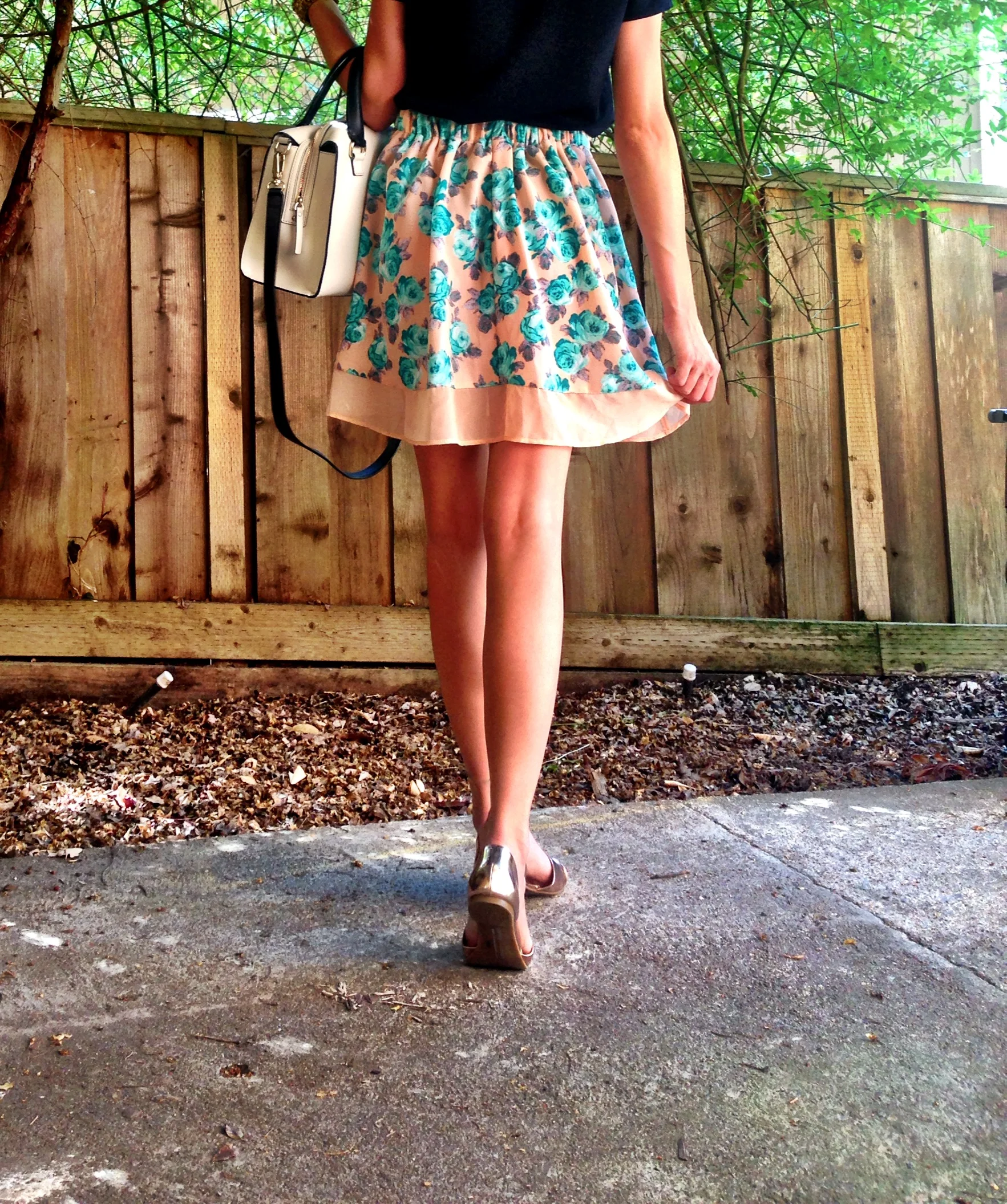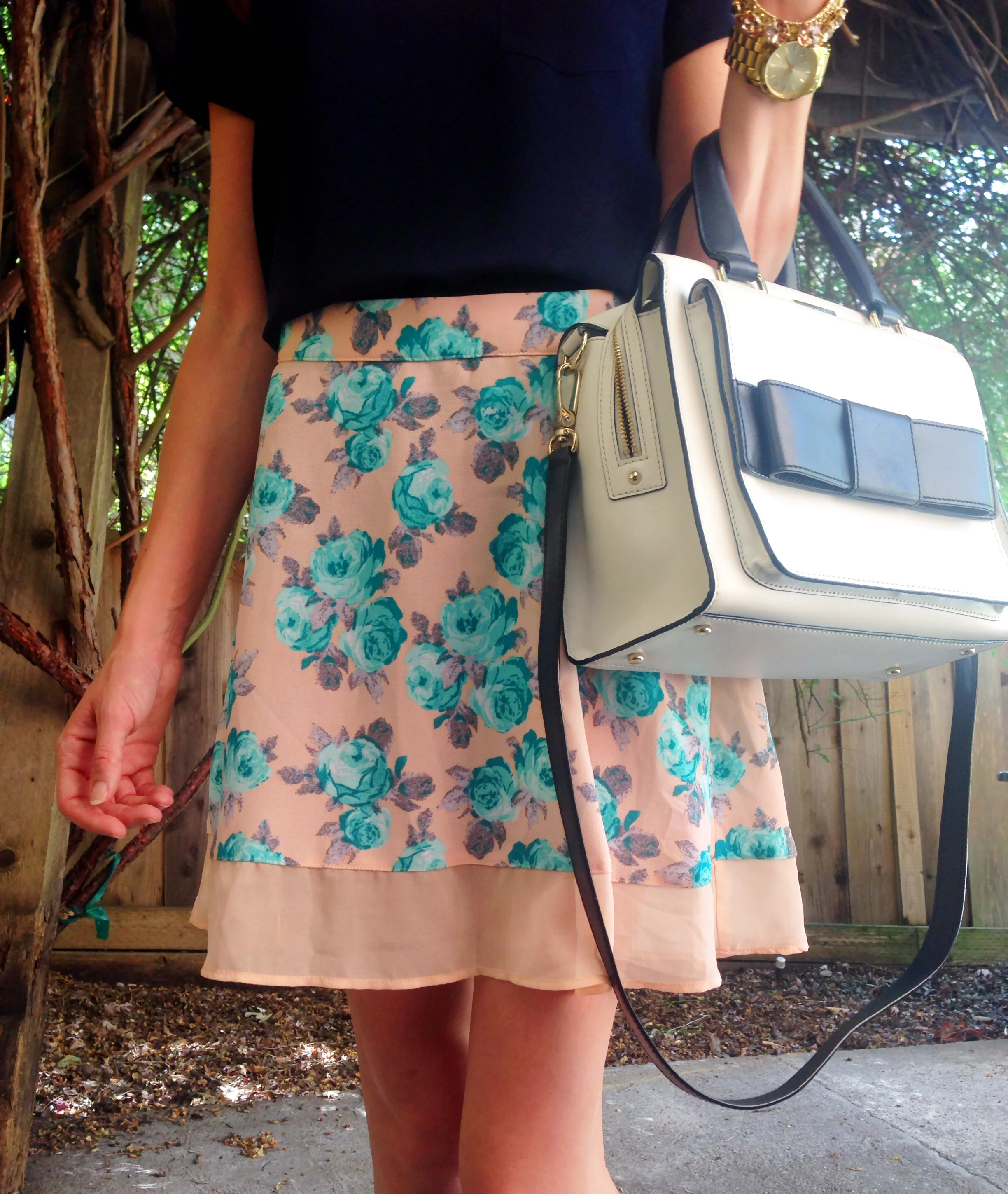 Out of all the prints and patterns out there, floral has got to be my fave. I always look forward to spring and summer when flowers are flourishing both in the ground and on the racks. I am drawn to floral like a moth to a flame, so when I saw this skirt at Target months ago, I knew it had to be mine. I love the soft peachy-pink color with the pops of blue, the feminine fabric, and swingy silhouette. There's something about a swing skirt that just makes you want to twirl, and I may have done a twirl or two. Or three.