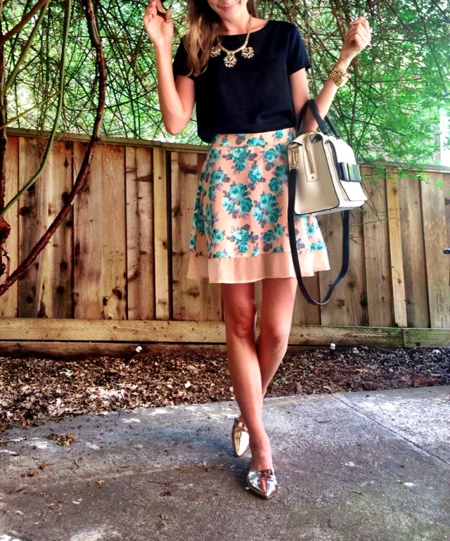 So I threw on my swing skirt, a simple navy blouse, and duh, pops of gold. Even after Fall officially rolls in, I can still see this skirt paired with booties and a comfy sweater, or a cute moto jacket. So it looks like I will be falling for floral and I'm definitely okay with that!