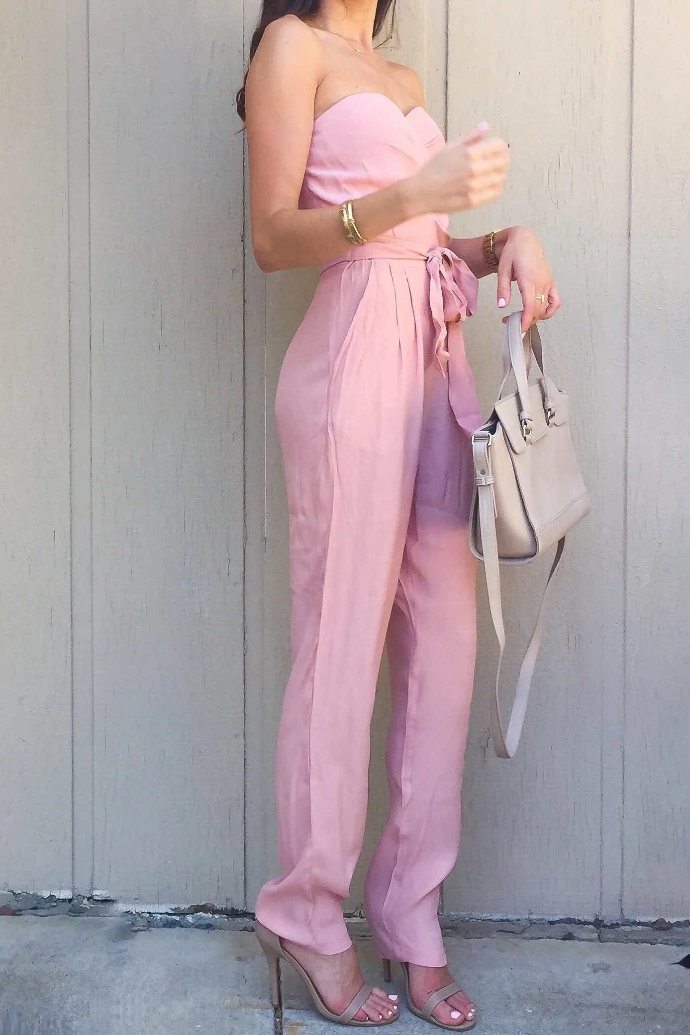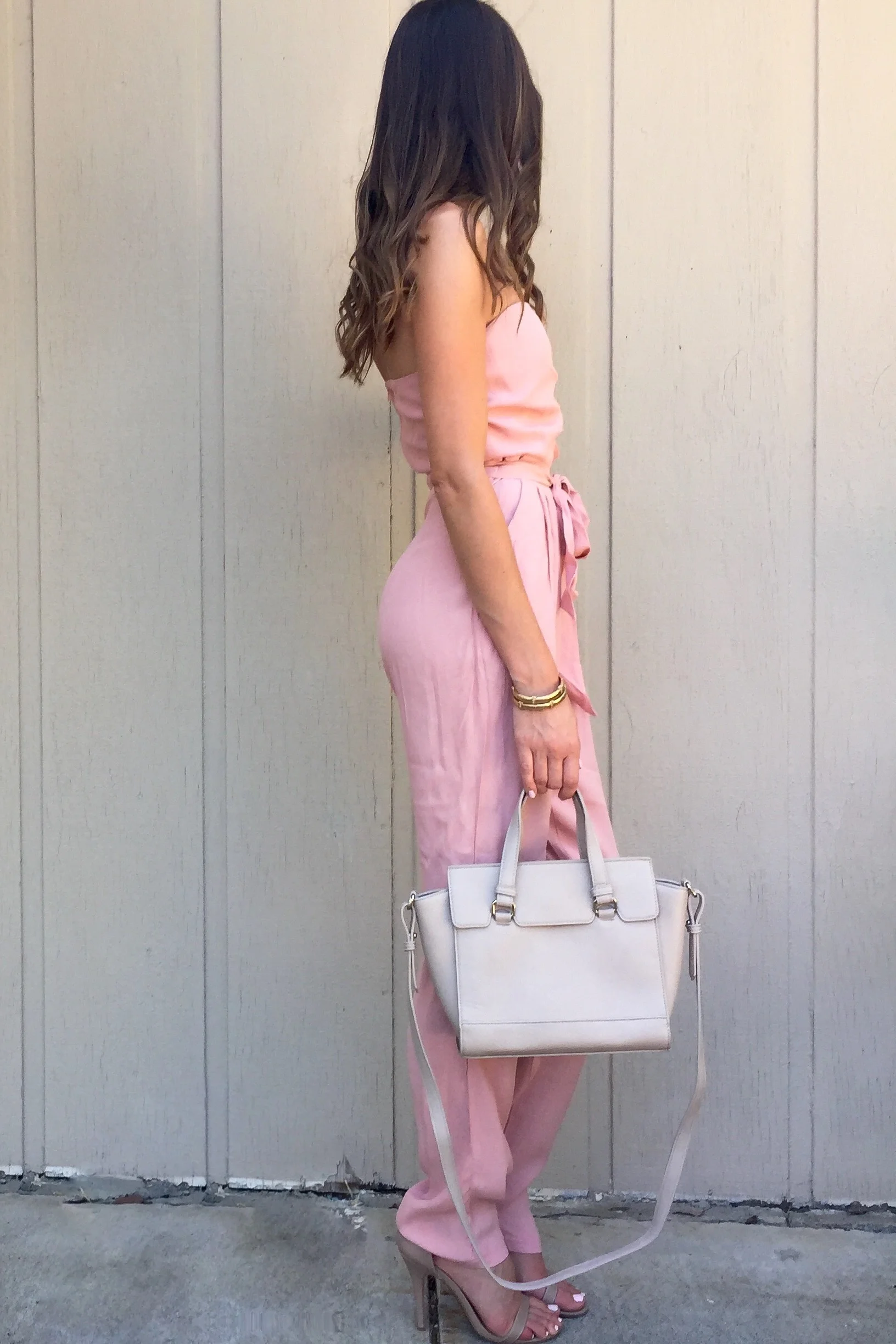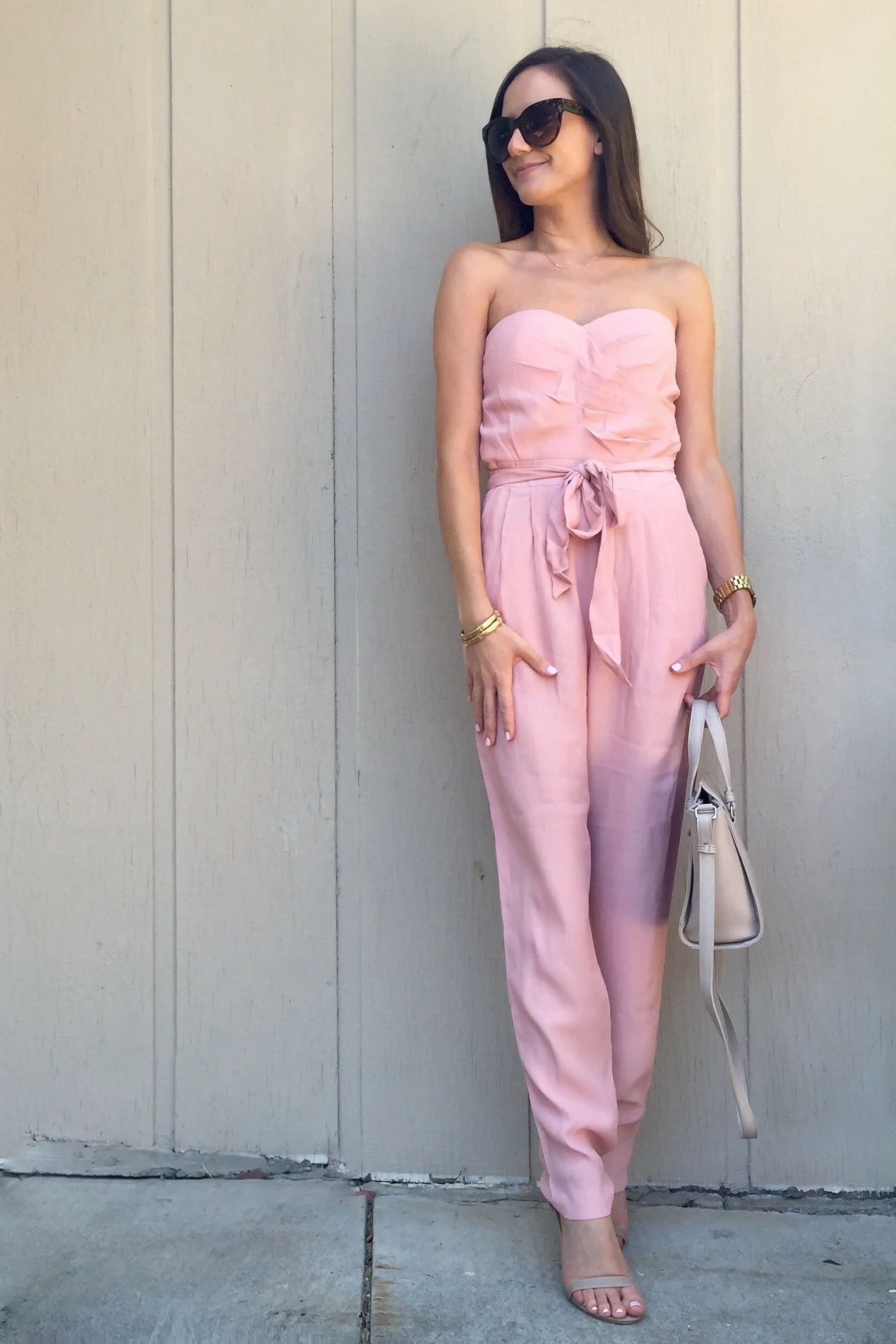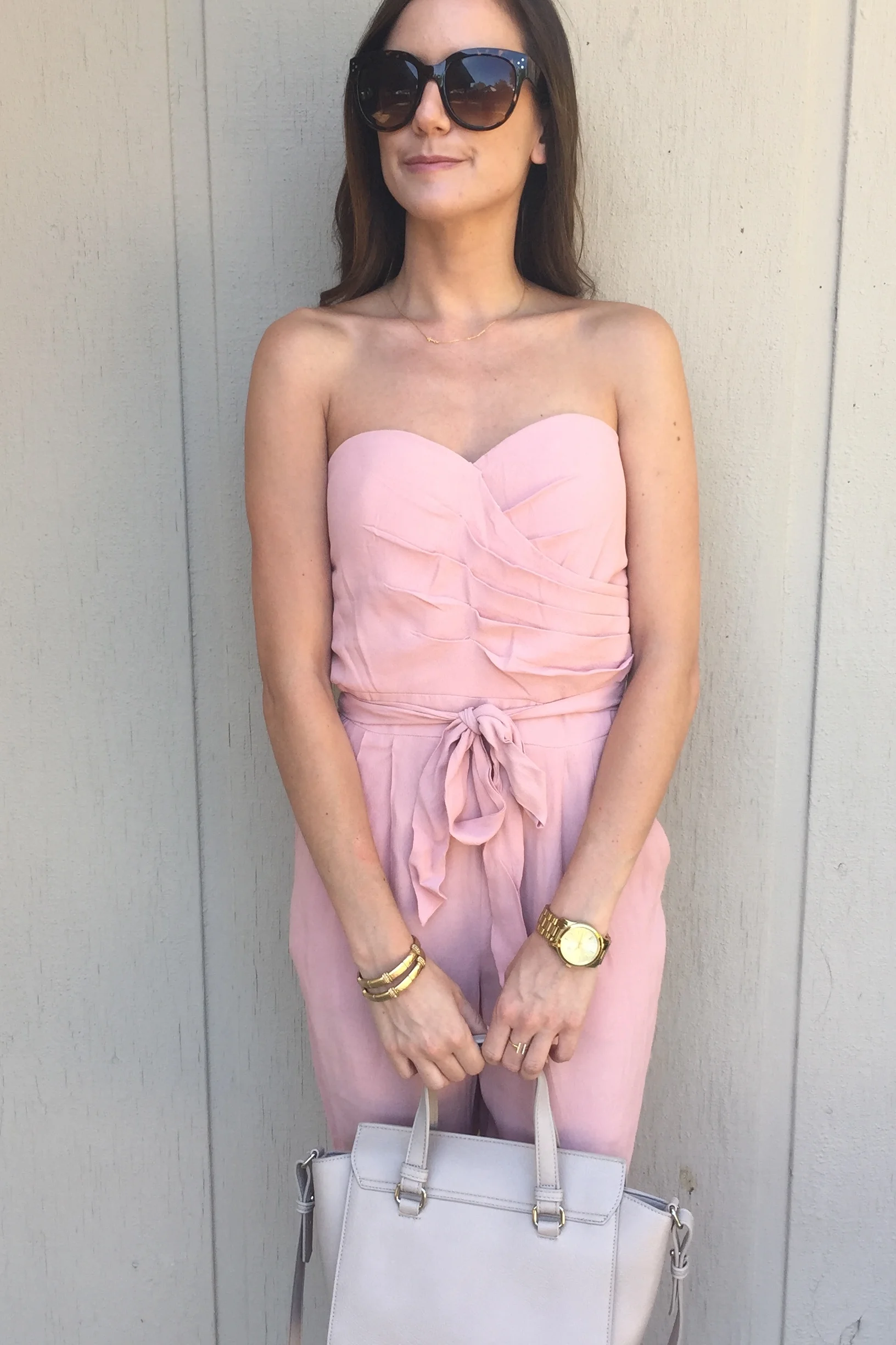 I snagged a flirty top along with this jumpsuit. I've NEVER tried a jumpsuit, but I'm seriously in love. The first comment that I got about this piece was that I looked "classic and chic." Umm...WINNING? Yes! I was a little nervous about the fit, but this one is perfect! I got a UK 8, which is a US 4. The blush color is like woah. Perfect.
