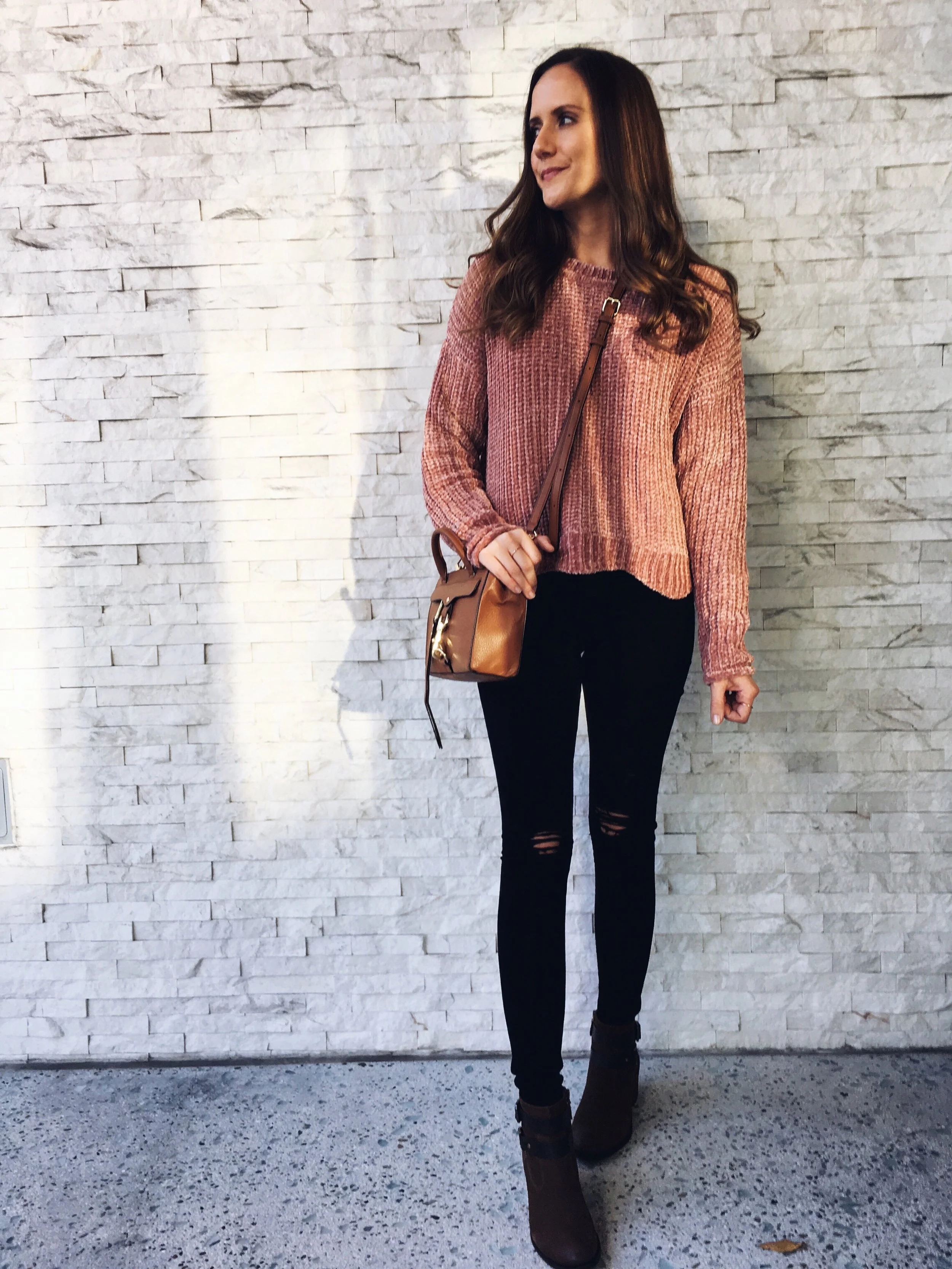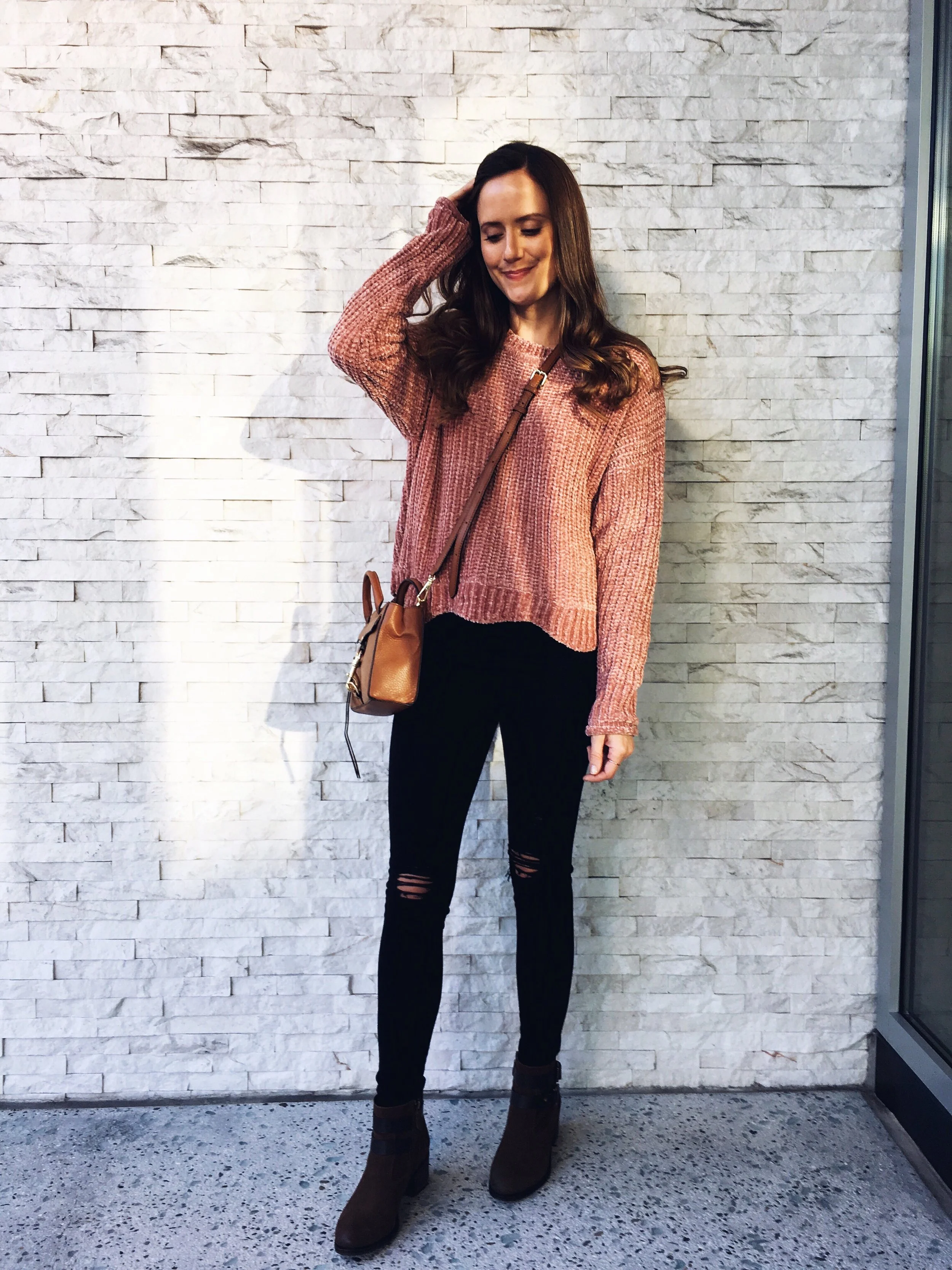 I'm all about a neutral wardrobe but when I do reach for color—blush is usually the one! I popped into Zara last month and found this perfect blush pink sweater. I've been loving chenille this season (I also have this favorite sweater in black and white) because it's soo cozy and soft. I love the scalloped hem on this one and how thick the knit is.