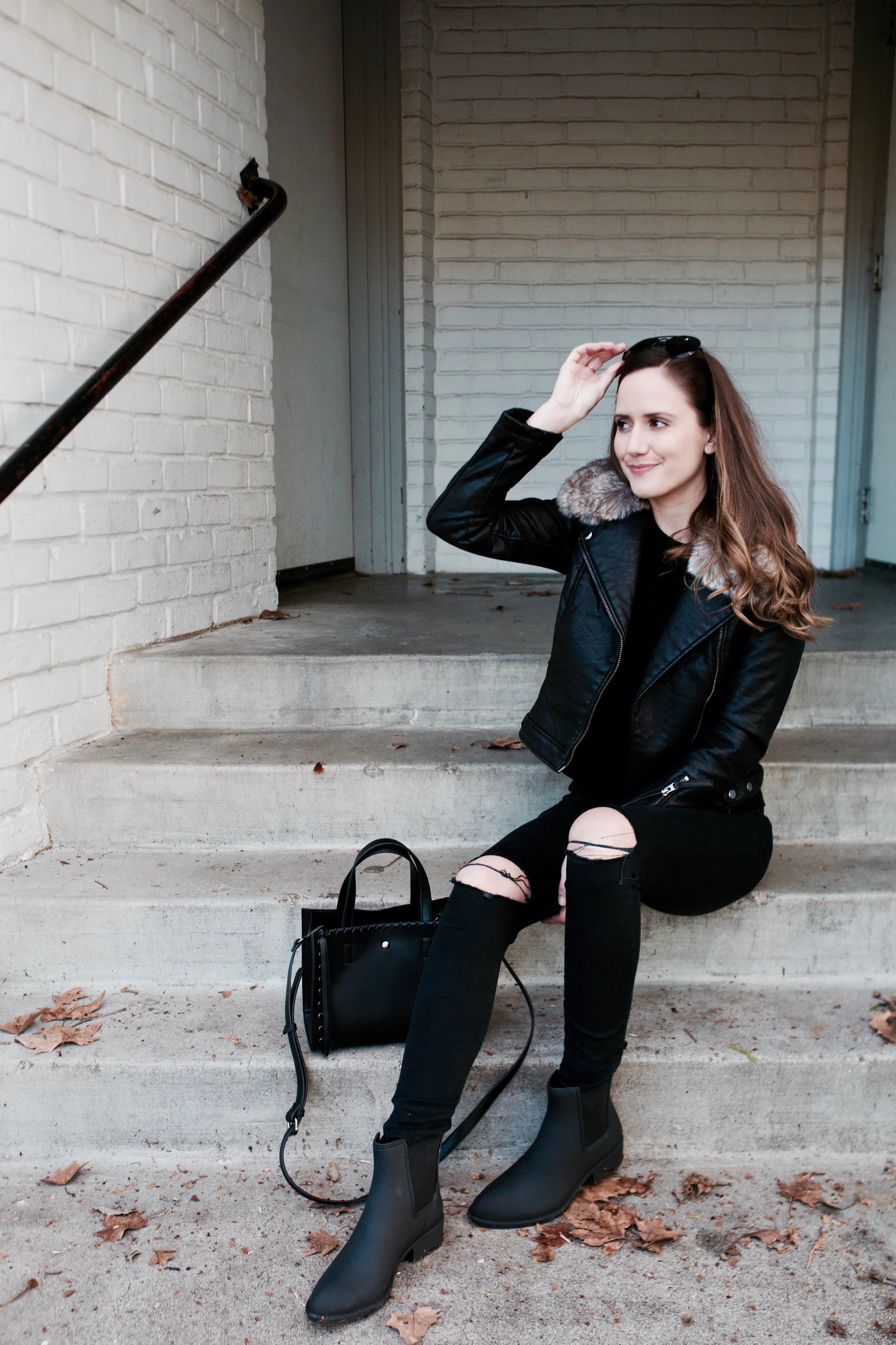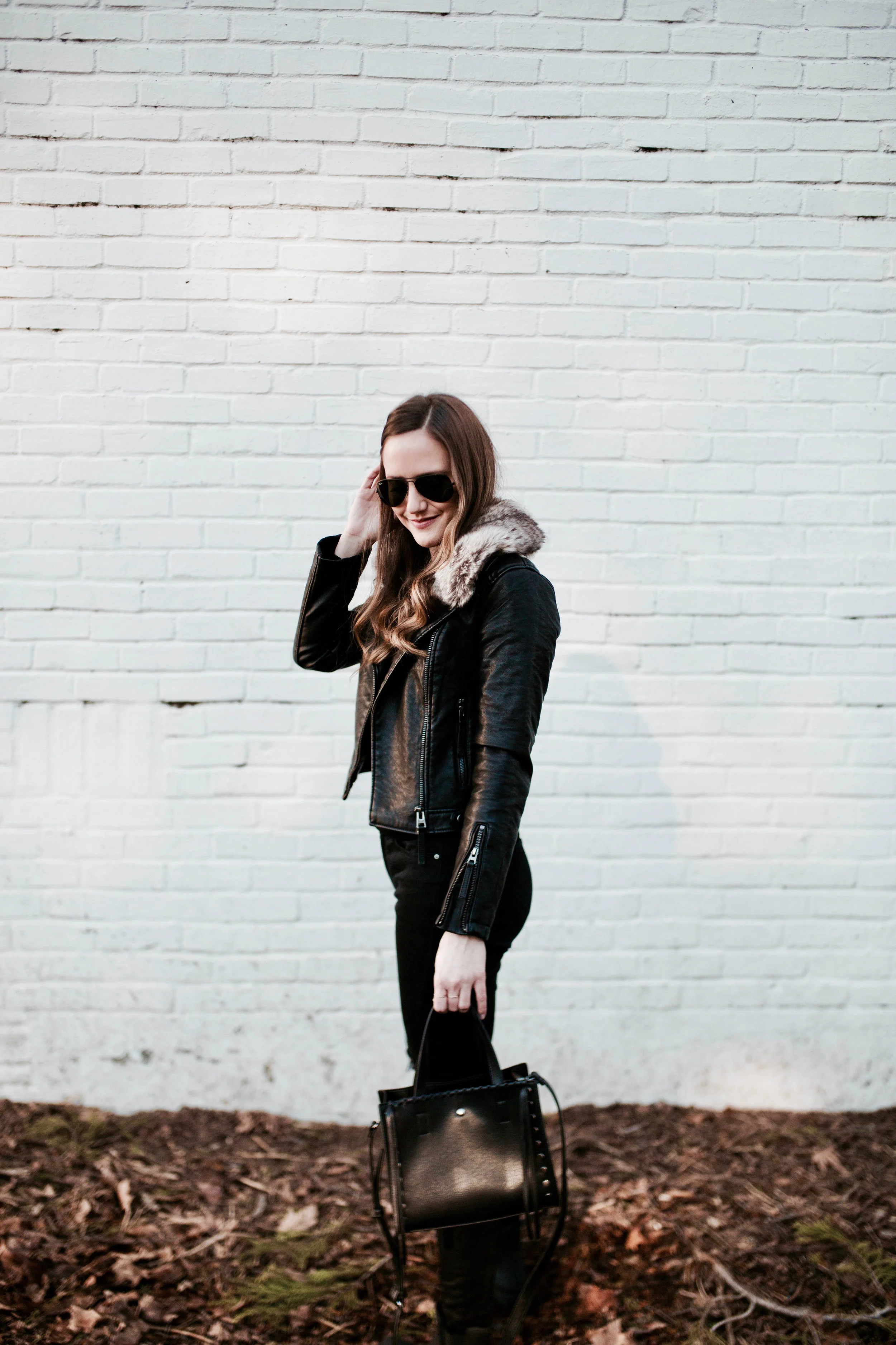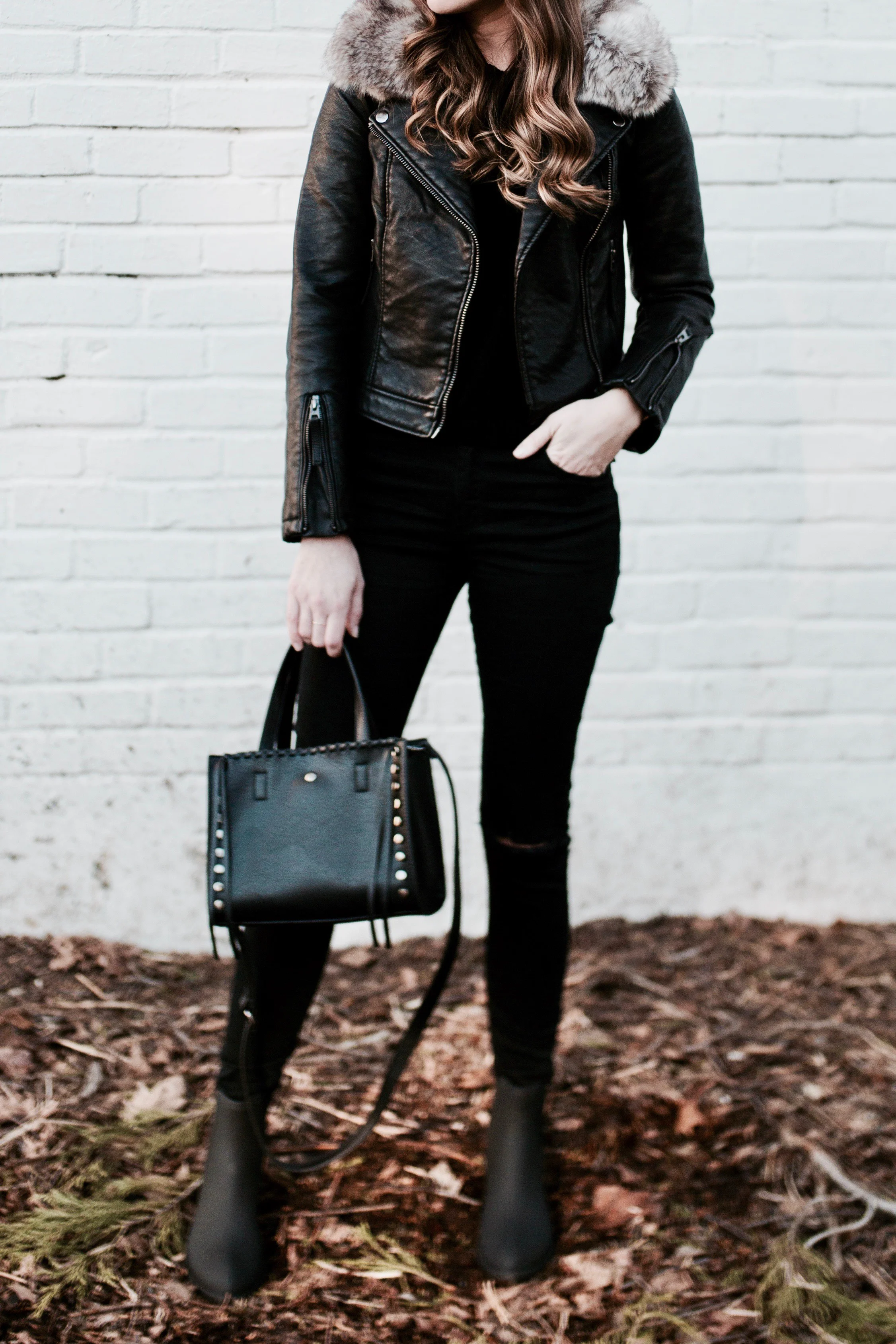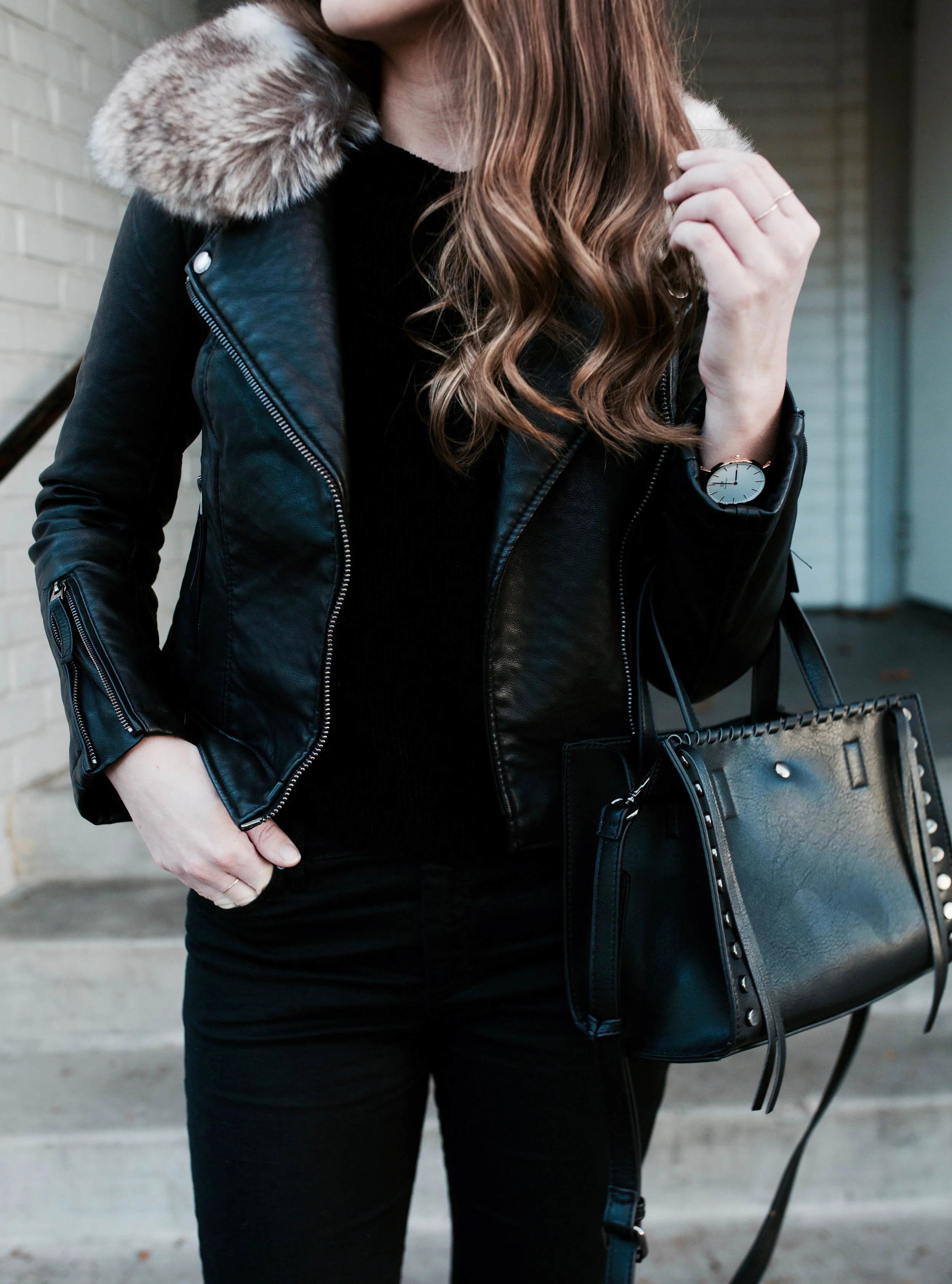 You DO probably know by now I'm all about a moto jacket. I love how effortless they are for both day and night and season to season and, of course, how they make any outfit look instantly edgy and cool. This winter I decided to add a little luxe touch to my collection with this Topshop faux fur collar moto from Nordstrom. I love how it gives this all-black ensemble a fancy feel.