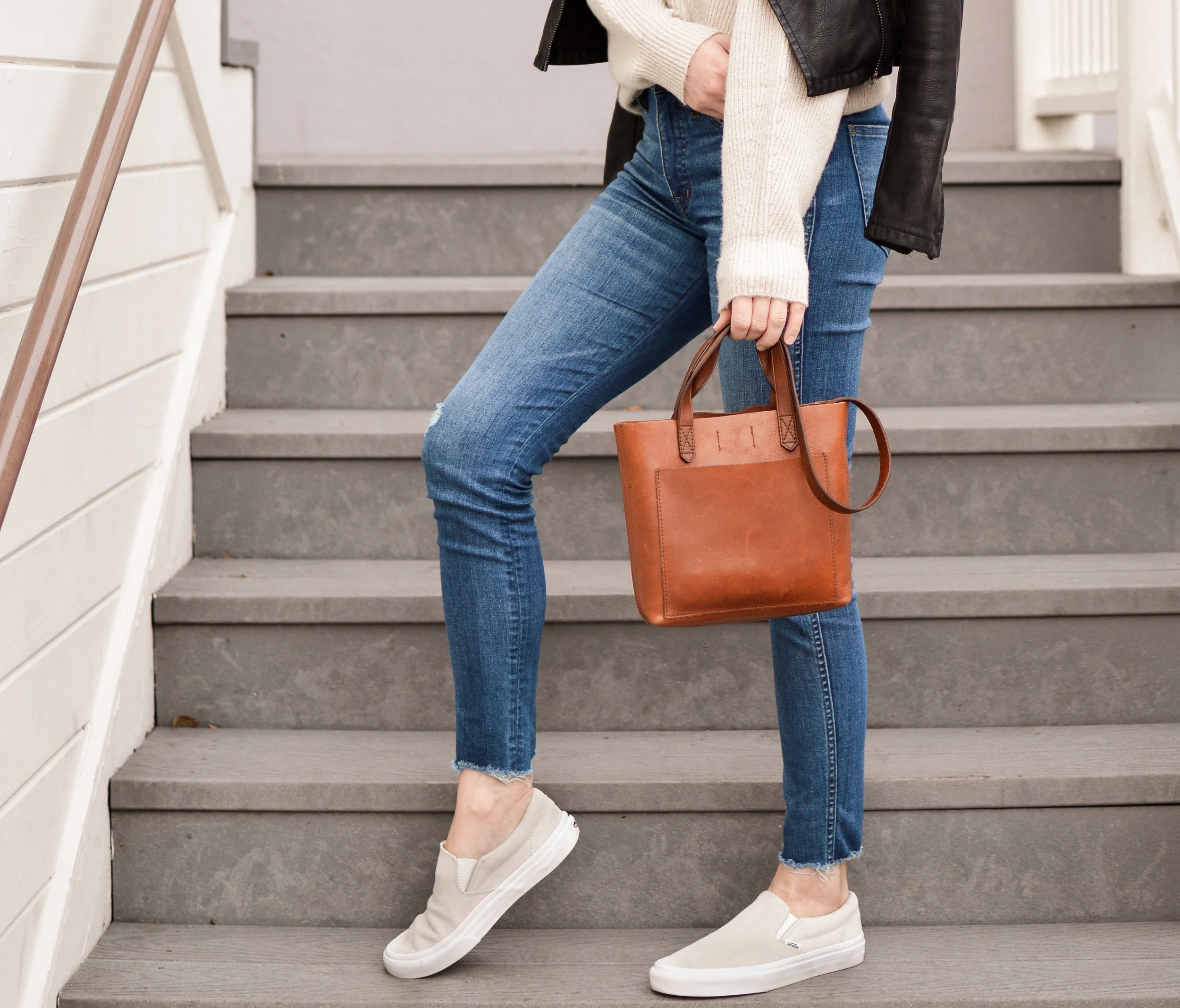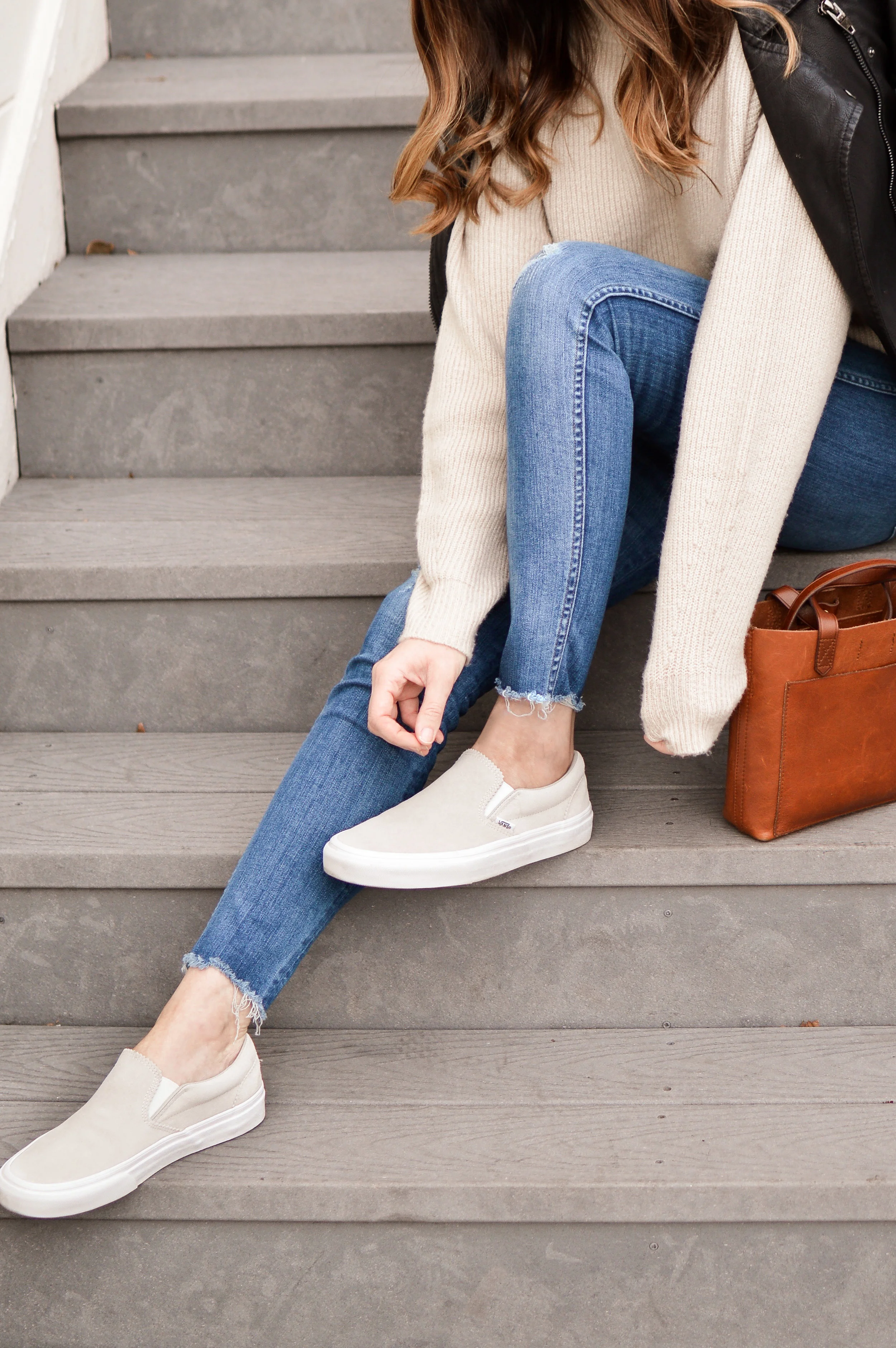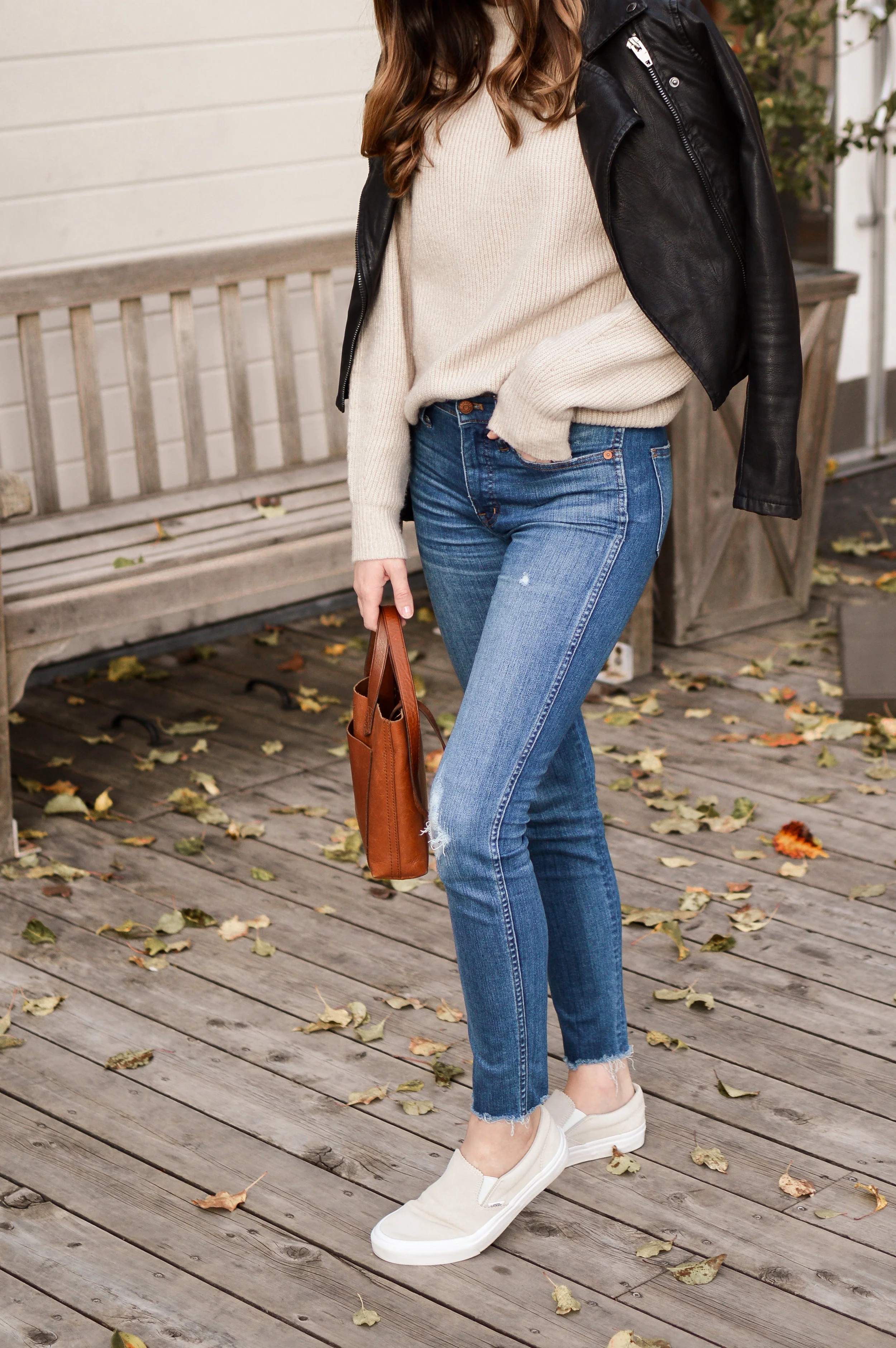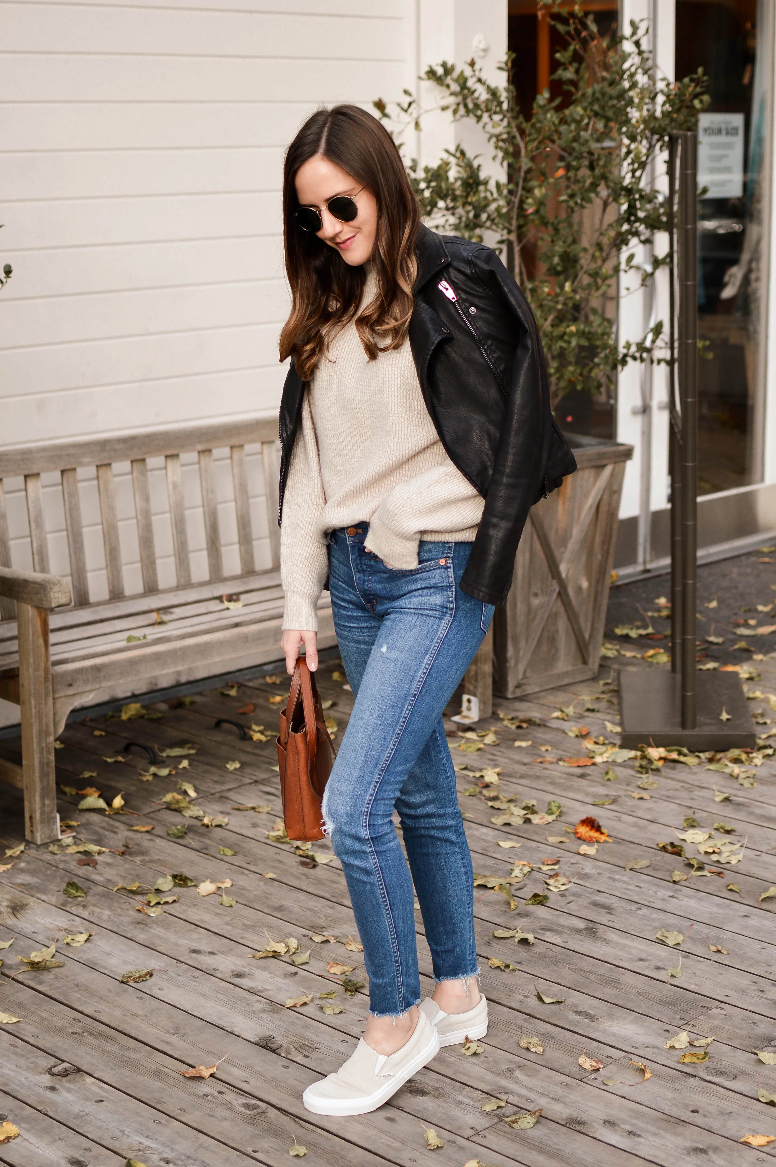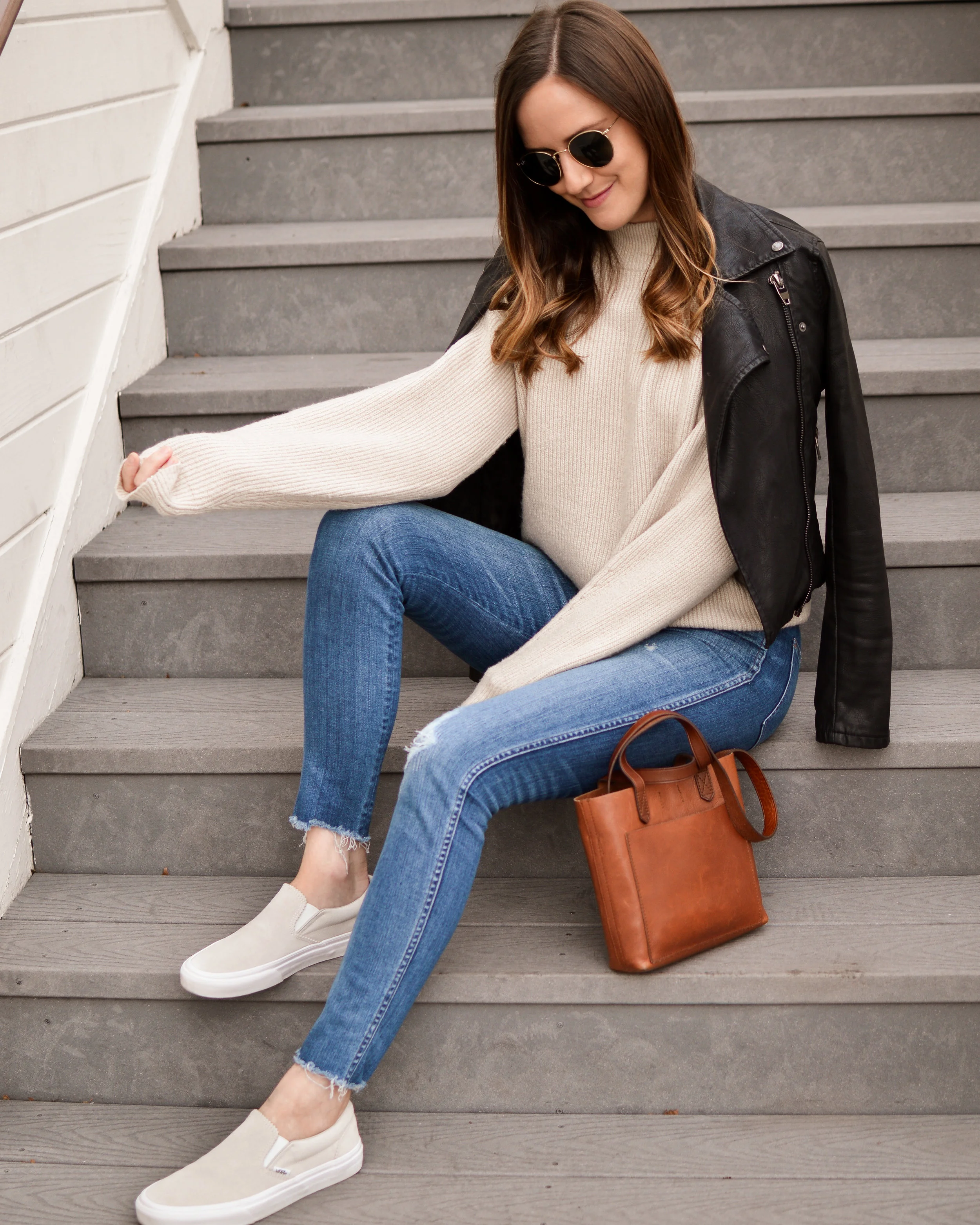 Shop the Look Below. Nordstrom Sweater | Madewell Jeans | BlankNYC Jacket (mine is last year's version) | Vans Sneakers | Madewell Tote | Ray-Ban Sunglasses