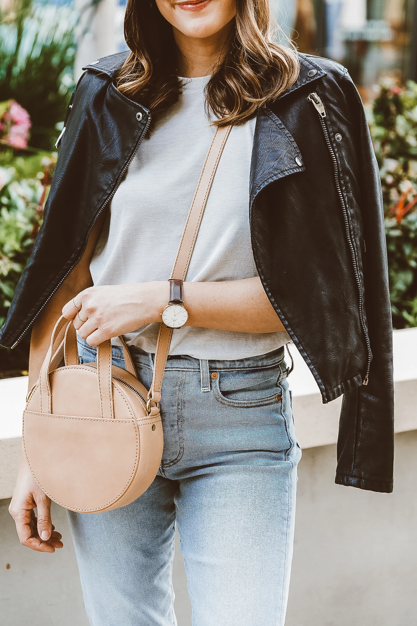 For this look, I slipped them on with high-rise jeans with a "Mom" feel and added an effortlessly soft tee and faux leather jacket for added coolness. If you grab your go-to bag (mine is always a crossbody and a circle style is right on trend), you'll be ready for wherever the day takes you but these leather kicks also make your lived-in joggers and a denim jacket look stylish.