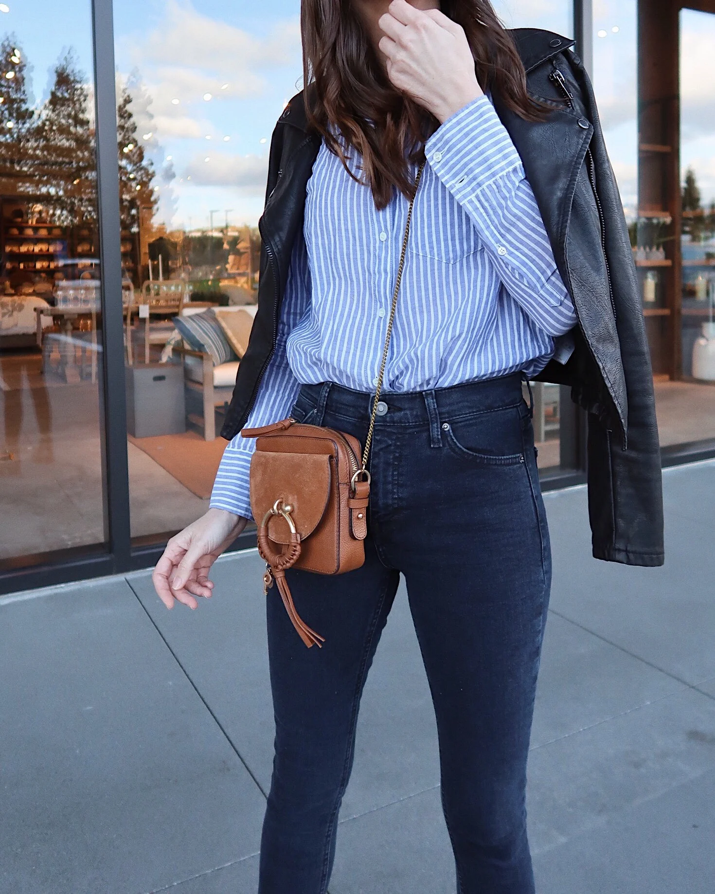 This was an incredibly easy look for an impromptu date night, made up of items most of us probably already have in our closet: the classic striped button-down (button-up?), dark wash denim, black booties and a moto/biker jacket. This look truly takes you from desk to dinner with ease. Keep a moto jacket on-hand or in your car and you can easily swap out your blazer or office cardigan.
