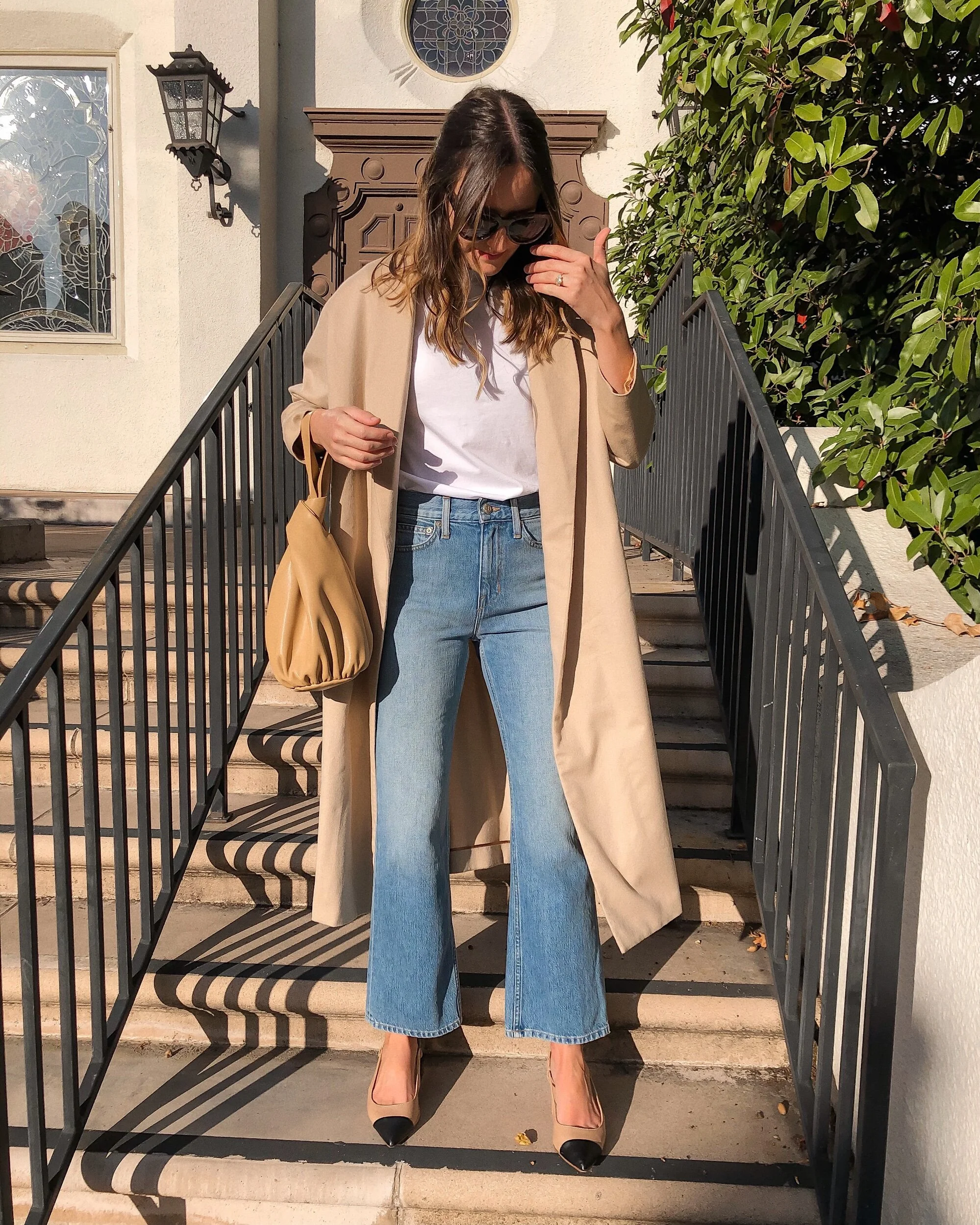 Elevate a jeans + white tee combo with a classic tan or camel coat. I love slipping on slingback flats or heels for an instantly chic and classic everyday fall ensemble.