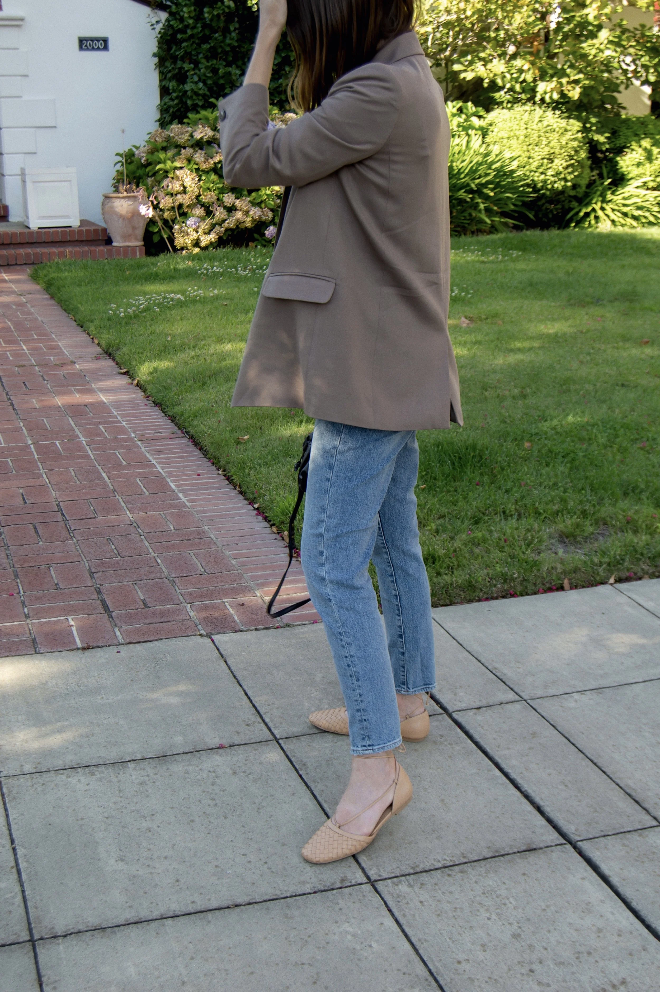 I took my usual size xs in the blazer and it has a relaxed fit that also works with the bump. I can technically still button it, though I wouldn’t as it gets a little stretched/messy. While it does run slightly oversized/relaxed through the body, I would probably steer away from sizing down as it is tighter through the upper arms. The only reason I’d size up is if you need more room through the upper arms/shoulders but note you may get a bit more room through the body.